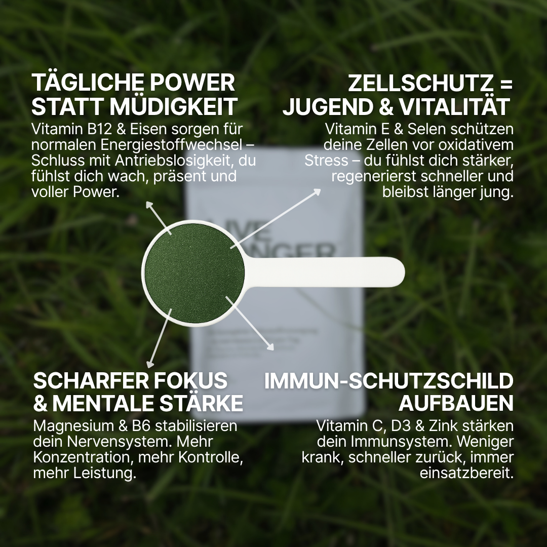LiveLonger ist ein hochwertiger, täglicher Superfood-Komplex mit über 30 natürlichen Inhaltsstoffen: Vitamine, Mineralstoffe, Probiotika, Adaptogene, Antioxidantien und Superfoods.