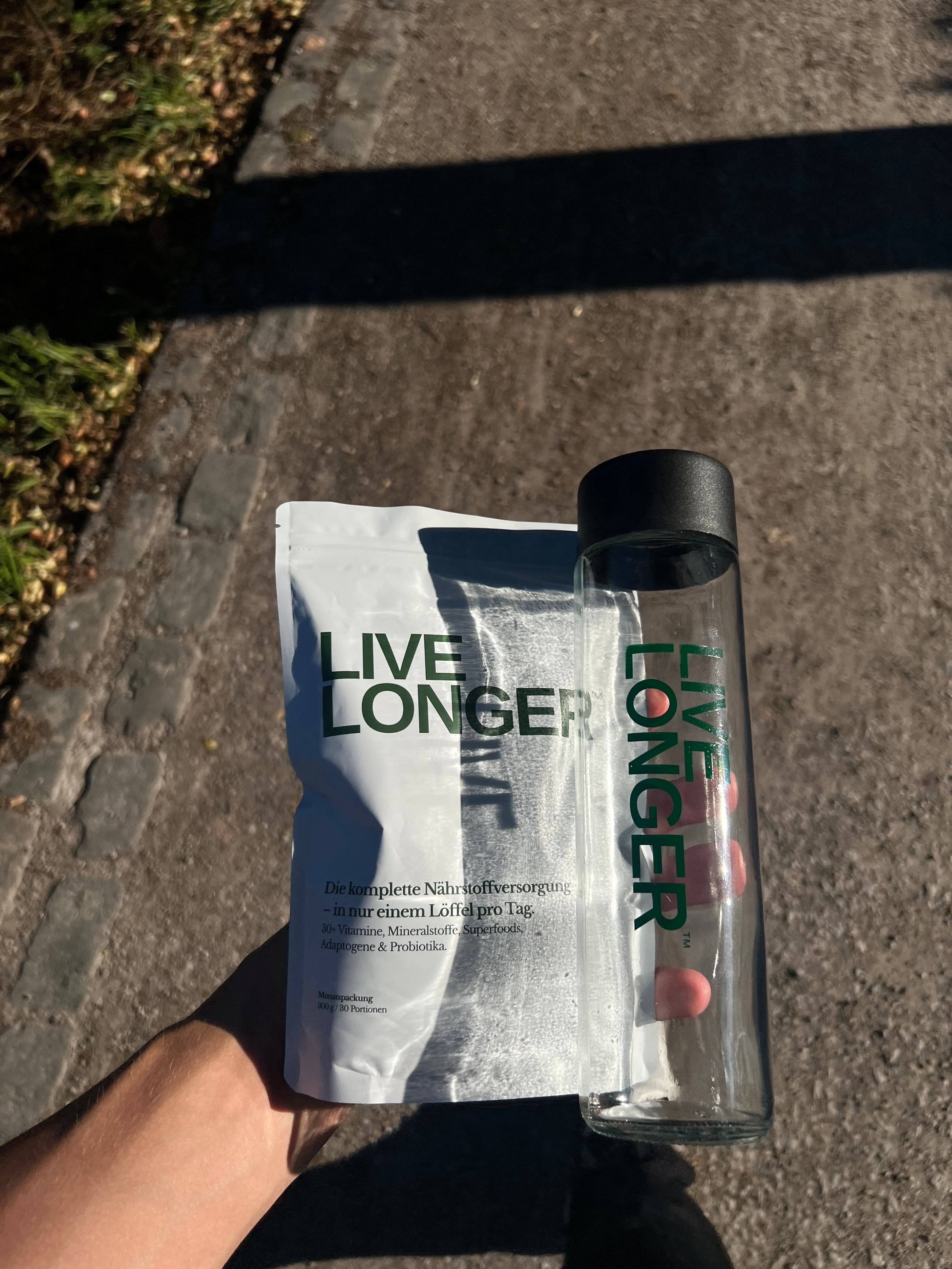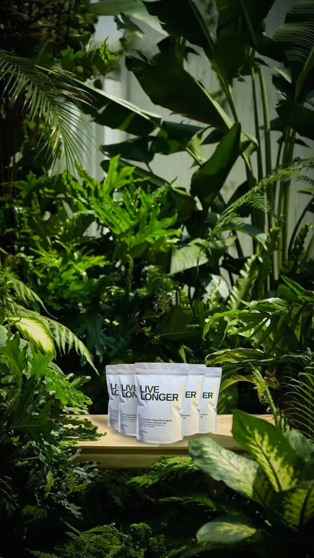 LiveLonger ist ein hochwertiger, täglicher Superfood-Komplex mit über 30 natürlichen Inhaltsstoffen: Vitamine, Mineralstoffe, Probiotika, Adaptogene, Antioxidantien und Superfoods.